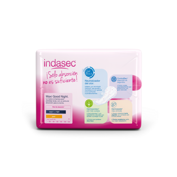 Indasec Dermoseda® Maxi Good Night es el apósito diseñado específicamente para ofrecer la seguridad extra que la noche requiere. Una garantía para el descanso.